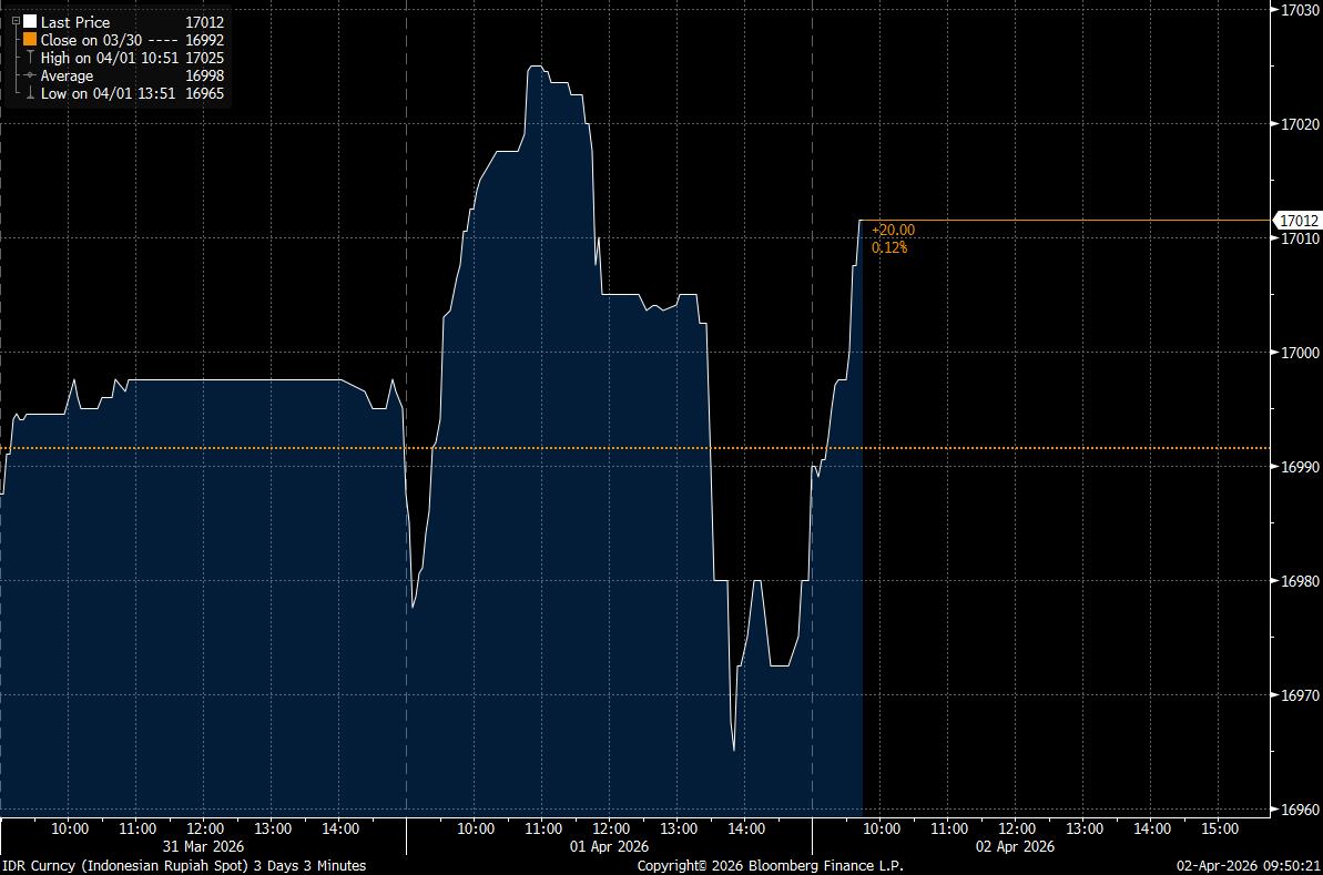 Bloomberg Technoz, Jakarta - Pertahanan rupiah jebol lagi di hari kedua April. Setelah kemarin rupiah sempat menembus Rp17.000-an/US$, rupiah kembali melemah 0,22% dan mengantarkannya ke level Rp17.017/US$ setelah sesi pembukaan yang stagnan pagi tadi.