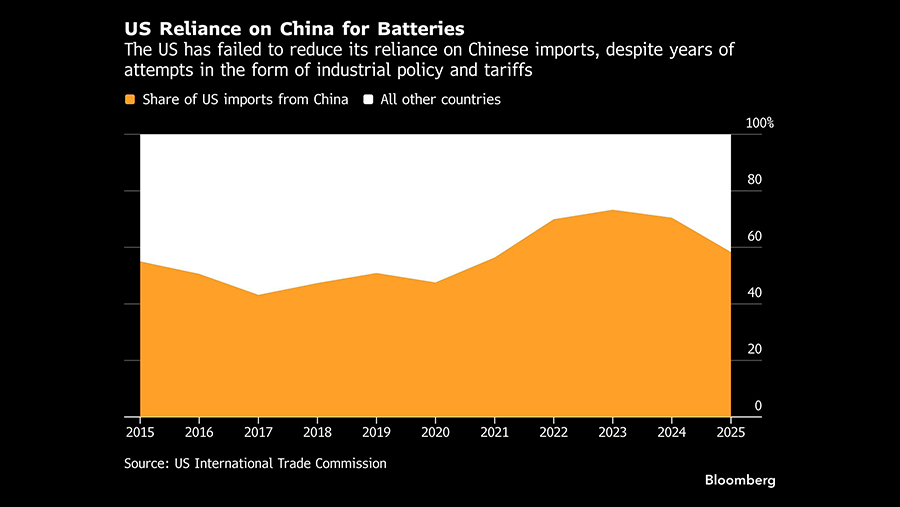 Pangsa impor AS untuk trafo dan peralatan pengatur arus dari China telah menurun secara stabil dalam beberapa tahun terakhir – meskipun untuk jenis peralatan tertentu, pangsa tersebut masih berkisar di angka 30%. Pangsa China dalam volume impor baterai tetap bertahan di atas 40%.