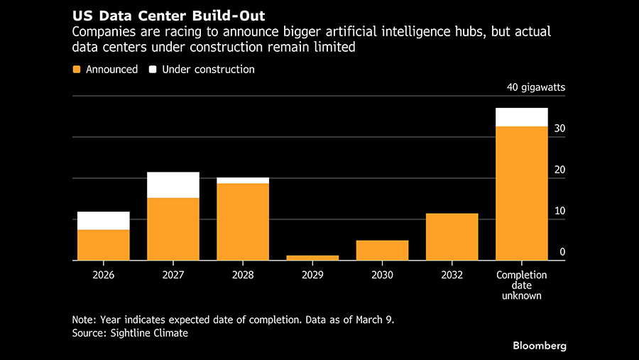 Pusat data yang mengonsumsi daya hingga 12 GW diperkirakan akan beroperasi pada 2026 di AS, menurut analis dari firma intelijen pasar Sightline Climate, yang akan merilis laporan baru dalam beberapa minggu mendatang. Namun, hanya sepertiga dari kapasitas tersebut yang saat ini sedang dalam tahap pembangunan, menurut perkiraan Sightline.
