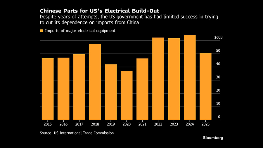 Kedua langkah tersebut tidak langsung meredakan permintaan, yang memaksa pengembang pusat data untuk mencari pasokan di luar negeri. Meskipun sebagian besar trafo AS berasal dari Kanada, Meksiko, dan Korea Selatan, perusahaan utilitas AS mengimpor lebih dari 8.000 trafo berdaya tinggi pada 2025 hingga Oktober dari China, naik dari kurang dari 1.500 unit yang diimpor sepanjang 2022, menurut perkiraan Boucher dari WoodMac. Pembangunan ini “akan sangat bergantung pada pasar impor,” katanya.