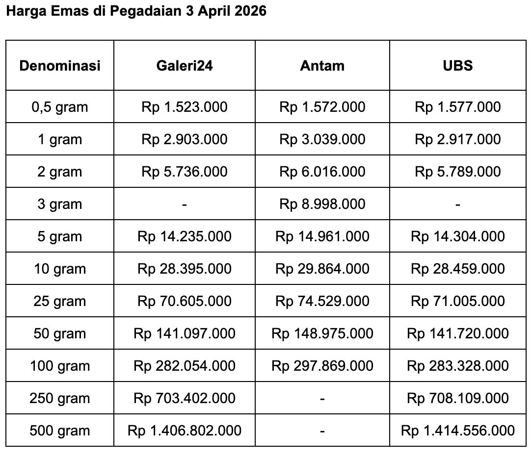 Lalu untuk emas batangan Galeri 24 ukuran 0,5 gram, Pegadaian menjual di harga Rp 1.523.000. Dalam sehari, turun Rp 3.000.