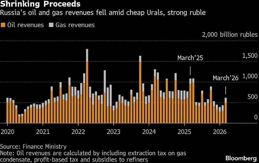 Penurunan ini mencerminkan bagaimana pajak Maret dihitung menggunakan harga Februari untuk Urals, campuran ekspor utama Rusia. Saat itu, harga Urals rata-rata di bawah US$45 per barel, menurut data pemerintah, jauh di bawah US$59 per barel yang diasumsikan dalam anggaran negara 2026.