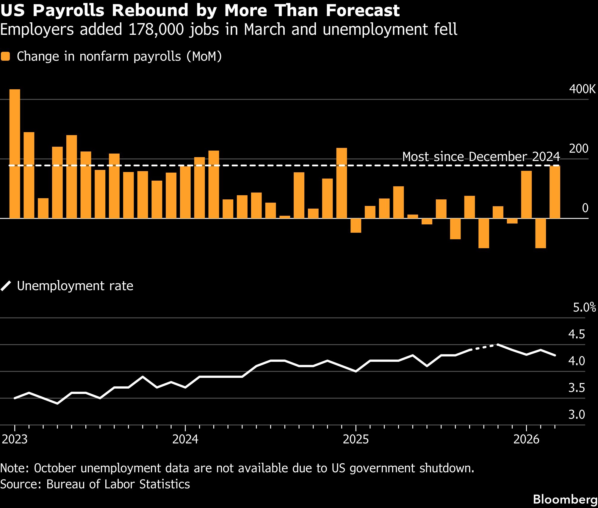 Berdasarkan data Biro Statistik Tenaga Kerja yang dirilis Jumat (3/4), nonfarm payrolls (penggajian non-pertanian) melonjak 178.000 bulan lalu—level tertinggi sejak akhir 2024. Angka ini melampaui seluruh estimasi dalam survei Bloomberg, setelah sebelumnya terjadi penurunan tajam pada Februari.