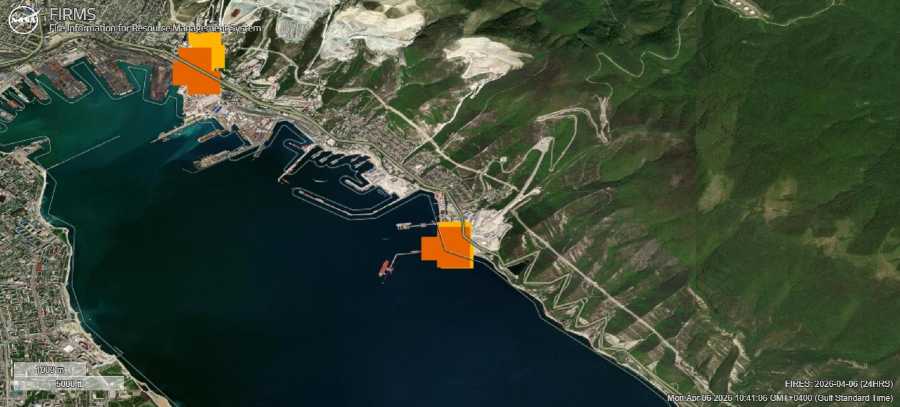 Citra satelit pada Senin (6/4/2026) dari Sistem Informasi Kebakaran untuk Manajemen Sumber Daya (Fire Information for Resource Management System/FIRMS) NASA menunjukkan kobaran api baru di kawasan pelabuhan Novorossiysk, tempat terminal Sheskharis milik Transneft PJSC berada.