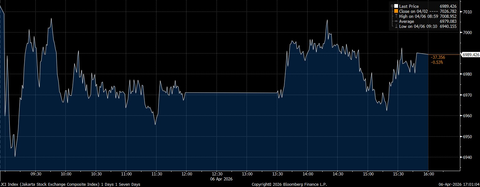 Bloomberg Technoz, Jakarta - Indeks Harga Saham Gabungan (IHSG) menutup perdagangan hari ini di zona merah pada Senin (6/4/2026). Melemahnya sejumlah saham–saham LQ45 berkapitalisasi besar atau saham big caps menjadi pemberat IHSG.