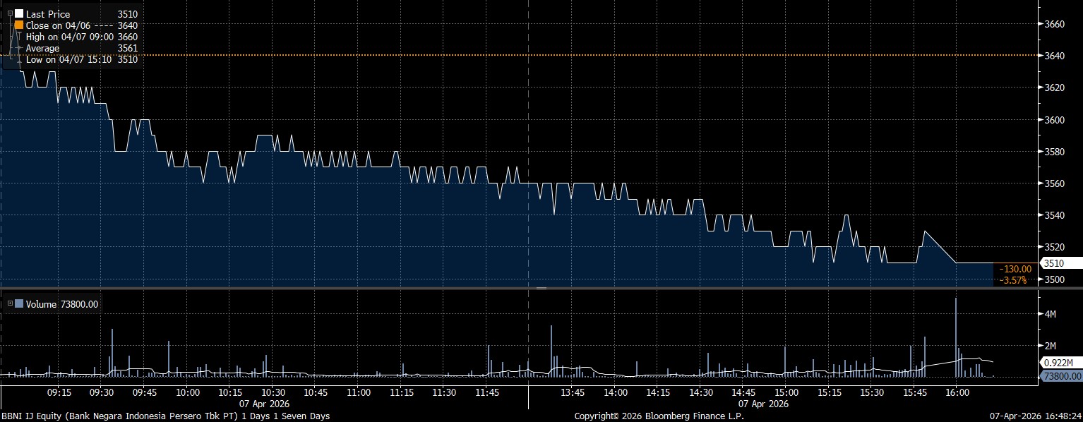 - PT Bank Negara Indonesia Tbk (BBNI) melemah 3,57% ke level Rp3.510