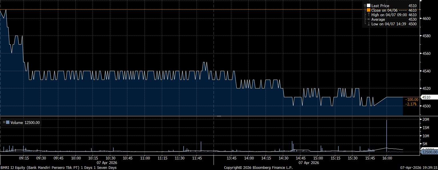 Adapun investor asing net sell terbesar pada saham PT Bank Mandiri Tbk (BMRI) mencapai Rp371,5 miliar. Imbas tekanan jual, saham BMRI melemah 2,17% di posisi Rp4.510/saham.