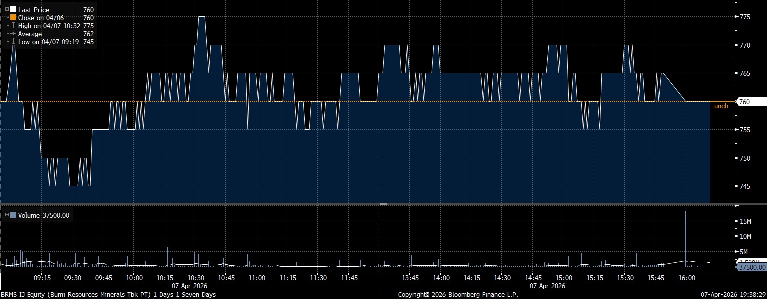 Pada saat bersamaan, investor asing net buy terbesar pada saham PT Bumi Resources Minerals Tbk (BRMS) mencapai Rp40,79 miliar. Biarpun pembelian terjadi, saham BRMS enggan melaju dan stagnan di posisi Rp760/saham.