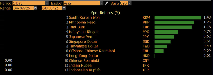 Won Korea Selatan menguat 1,51%, disusul baht Thailand 1,15%, lalu ringgit Malaysia 0,72%, yen Jepang 0,65%, dolar Singapura 0,49%, yuan offshore China 0,26%, dan dolar Hong Kong 0,01%.