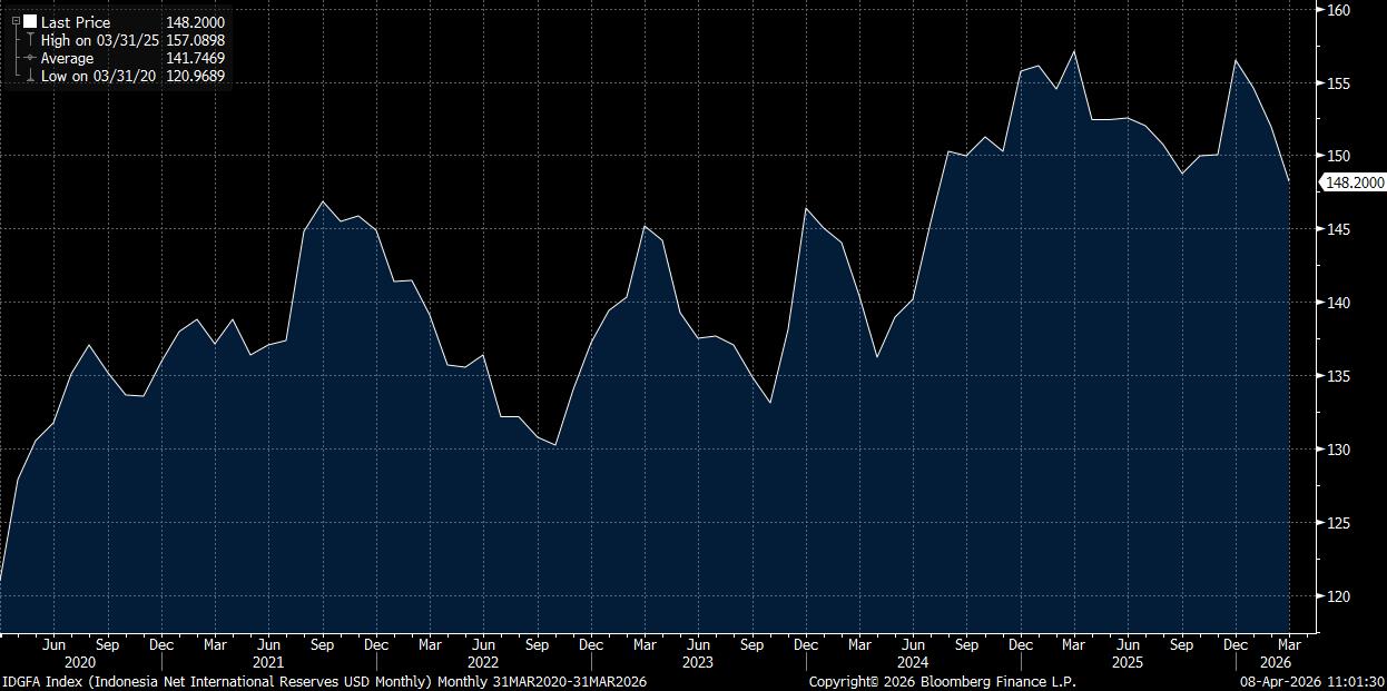 Melansir laman BI pada Rabu (8/4/2026), cadangan devisa Indonesia menyusut US$3,7 miliar dibandingkan bulan sebelumnya menjadi US$148,2 miliar dari US$151,9 miliar pada Februari 2026.