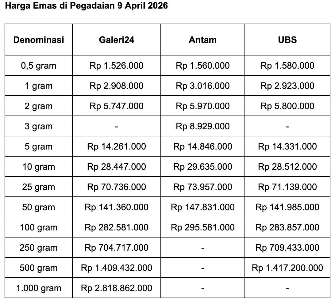 Lalu untuk emas batangan Galeri 24 ukuran 0,5 gram, Pegadaian menjual di harga Rp 1.526.000. Lebih mahal Rp 33.000 dari harga kemarin.
