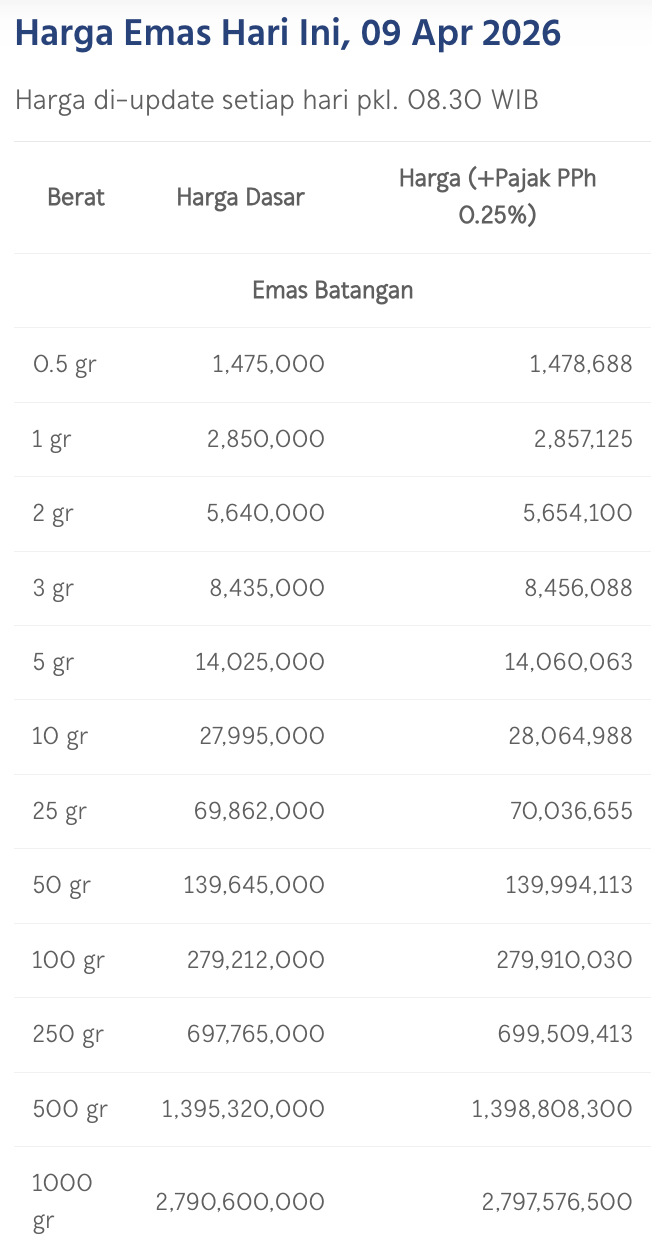 Pada Kamis (9/4/2026), emas Antam dihargai Rp 2.850.000/gram. Melemah Rp 50.000 dibandingkan posisi hari sebelumnya.