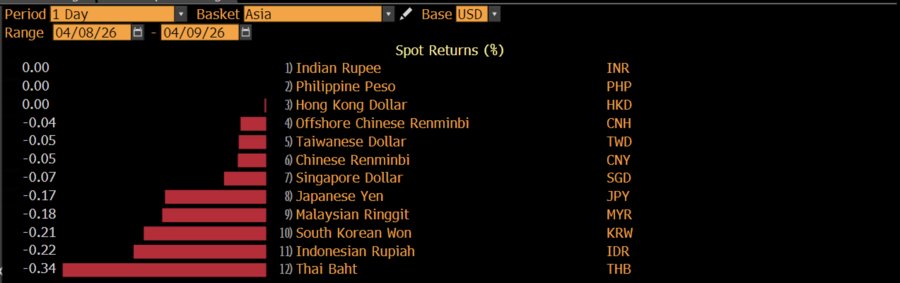 Kenaikan harga minyak ikut melemahkan sebagian besar mata uang kawasan Asia. Baht Thailand memipin pelemahan, disusul won Korea Selatan, ringgit Malaysia, yen Jepang, dolar Singapura, dolar Taiwan, yuan China, dan yuan offshore.