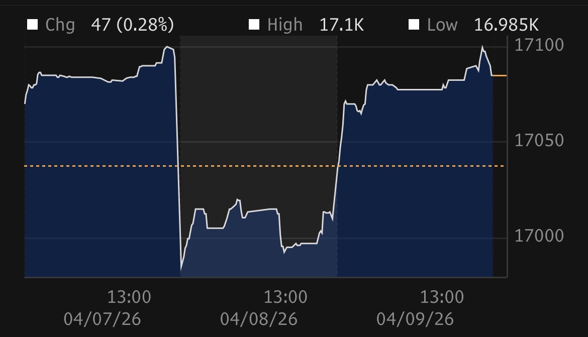 Pergerakan nilai tukar rupiah terhadap dolar AS dalam tiga hari terakhir, hingga Kamis sore (9/4/2026). (Bloomberg)