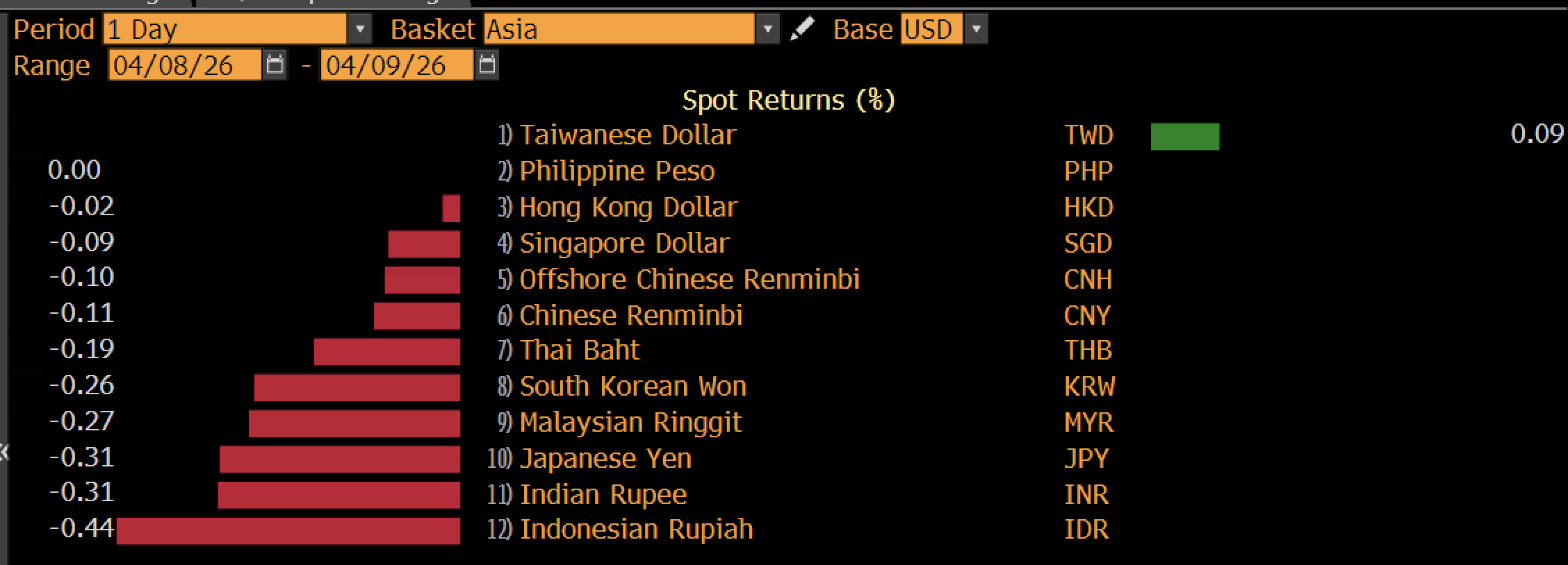 Setelah rupiah, rupee India dan yen Jepang menyusul dengan pelemahan 0,31%, lalu ringgit Malaysia 0,27%, won Korea Selatan 0,26%.