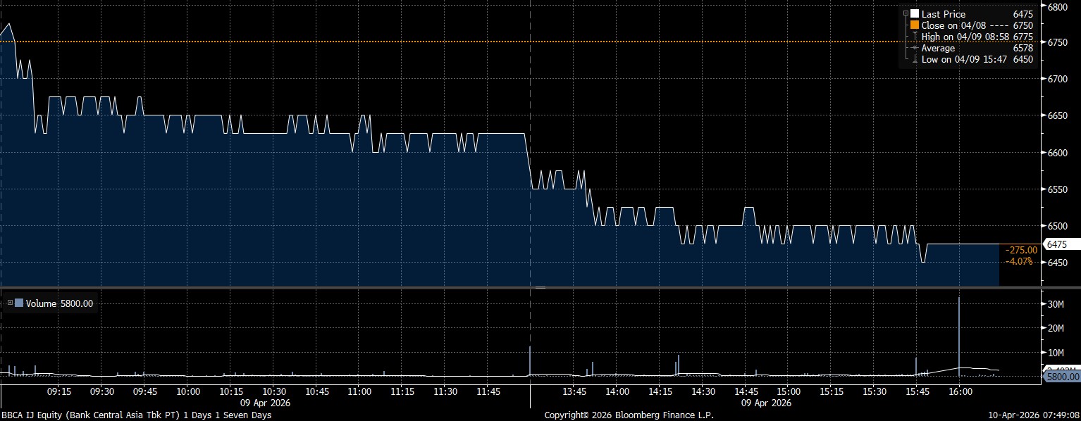 Adapun investor asing net sell terbesar pada saham PT Bank Central Asia Tbk (BBCA) mencapai Rp611 miliar. Imbas derasnya tekanan jual, saham BBCA melemah 4,07% di posisi Rp6.475/saham.