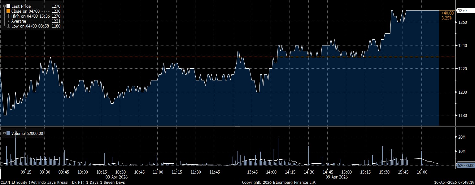 Pada saat bersamaan, investor asing net buy terbesar pada saham PT Petrindo Jaya Kreasi Tbk (CUAN) mencapai Rp82,92 miliar. Terdorong pembelian, saham CUAN menguat 3,25% hingga melesat di posisi Rp1.270/saham.
