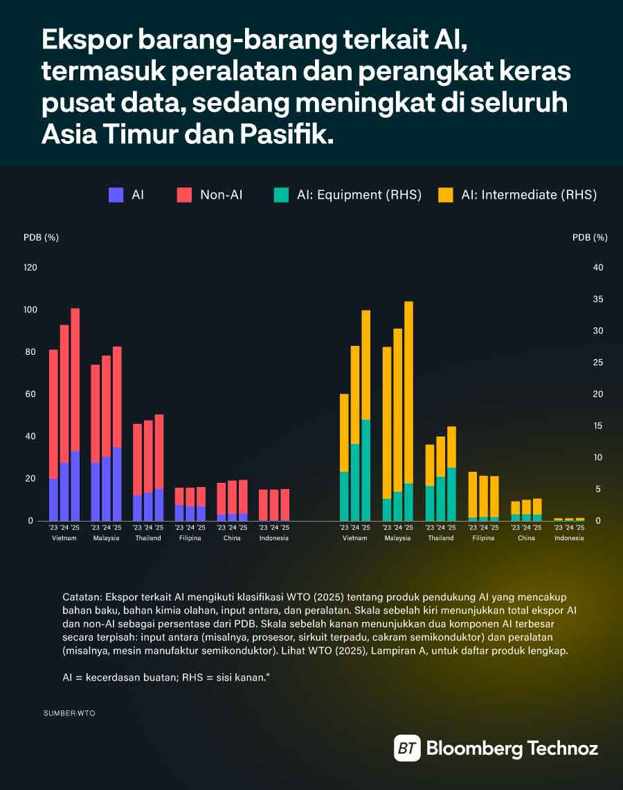 Keempat, Indonesia tercatat belum berhasil memanfaatkan peluang dari booming industri teknologi global. Bank Dunia menunjukkan bahwa pertumbuhan ekspor di kawasan ini pada 2025 didorong oleh lonjakan permintaan produk elektronik dan terkait Artificial Intelligence (AI) alias kecerdasan buatan.