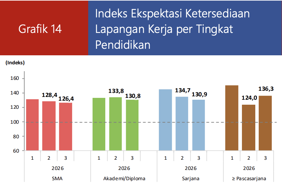 Pada kelompok pendidikan, penurunannya hampir merata. Lulusan SMA, diploma, hingga sarjana sama-sama menunjukkan penurunan ekspektasi terhadap peluang kerja.