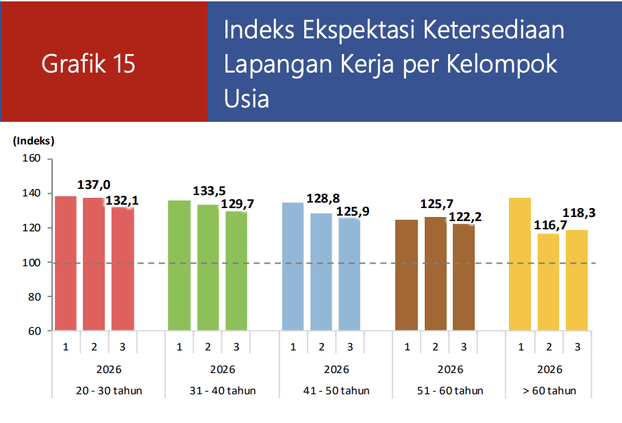 Pola yang sama juga terlihat dari kelompok usia produktif, mulai 20 tahun hingga 60 tahun, yang mengalami penurunan ekspektasi terhadap leuang kerja.