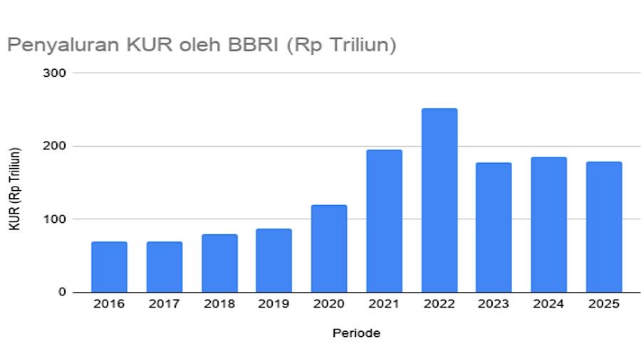Pada 2025, penyaluran KUR oleh BBRI mencapai Rp 178,08 triliun kepada 3,8 juta debitur. BBRI menjadi penyalur KUR terbesar dari 49 bank lainnya.