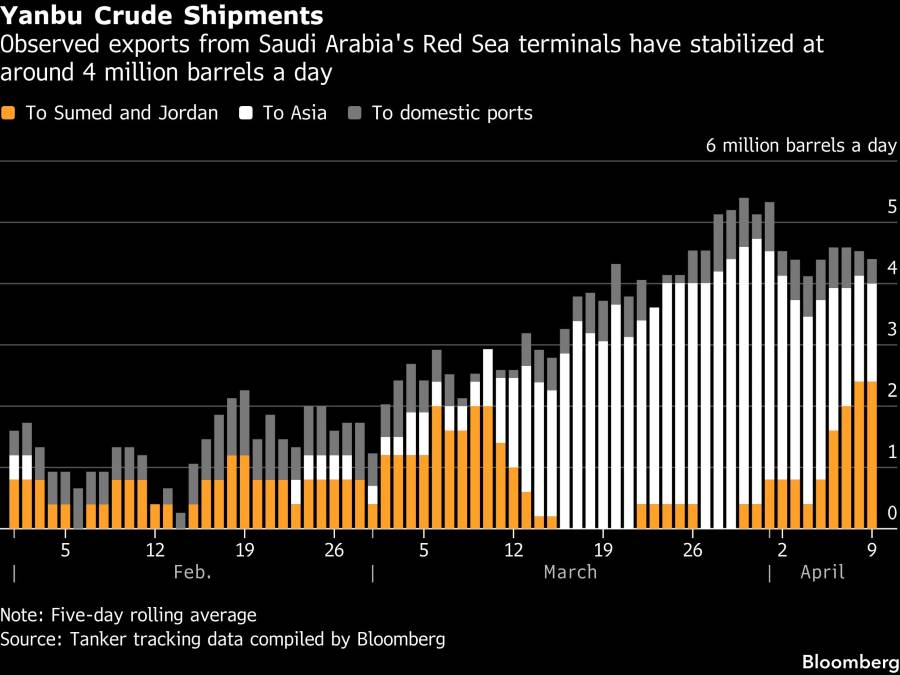 Arab Saudi telah melipatgandakan pengiriman minyak mentah dari terminal Laut Merah menjadi sekitar 4 juta barel per hari sejak akhir Februari, meredam dampak penutupan hampir total Selat Hormuz. Ekspor tetap stabil pada level tersebut, menurut data pelacakan kapal tanker yang dikumpulkan oleh Bloomberg.