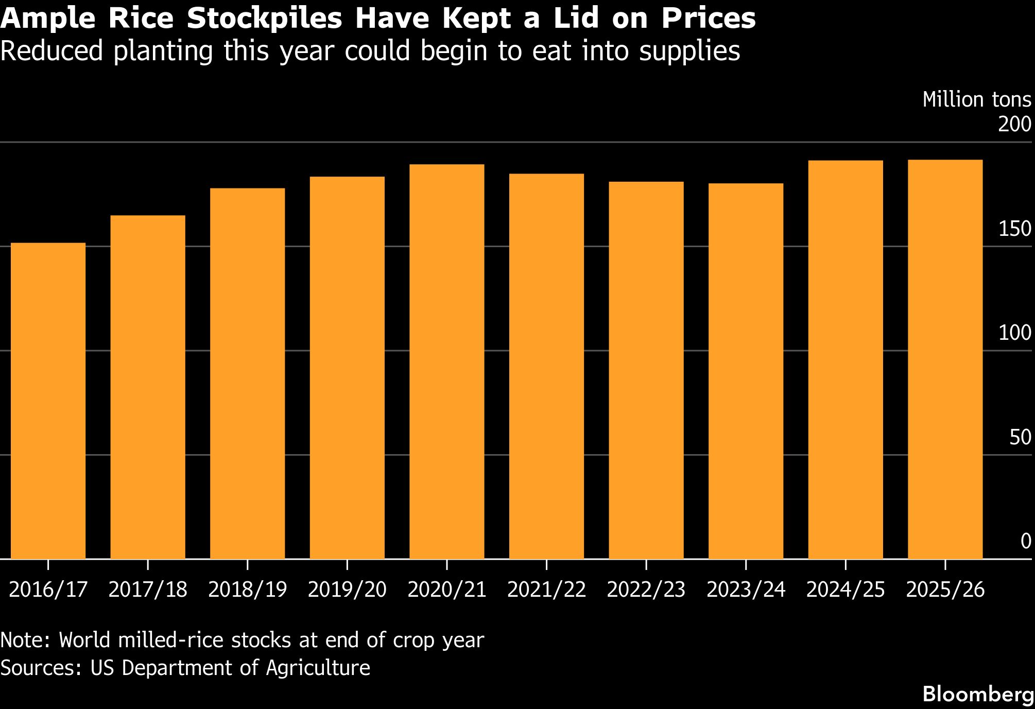 Terbebani oleh persediaan yang melimpah, harga patokan untuk beras putih Thailand 5% pecah jatuh ke level terendah dalam satu dekade pada akhir Oktober dan hanya pulih sedikit sejak saat itu, menghabiskan sebagian besar bulan lalu di bawah US$400/ton.