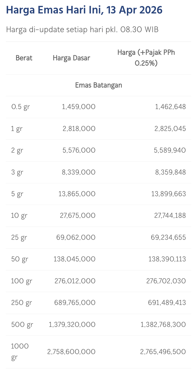 Pada Jumat (10/4/2026), emas Antam dihargai Rp 2.818.000/gram. Melemah Rp 42.000 dibandingkan posisi perdagangan terakhir pada 11 April.