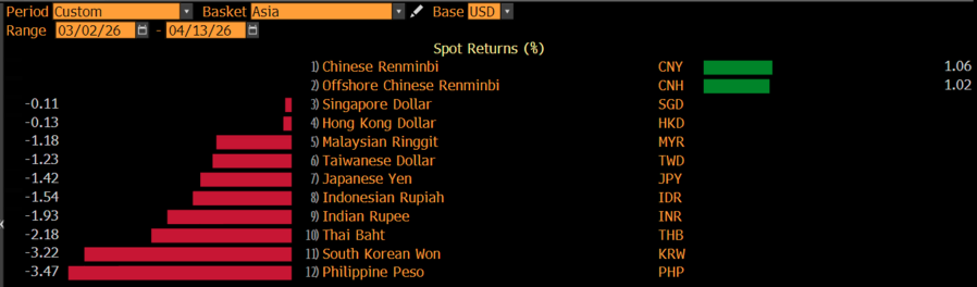 Peso Filipina menjadi mata uang paling tertekan, disusul won Korea Selatan, lalu baht Thailand, rupee India, rupiah, yen Jepang, dolar Taiwan, dan ringgit Malaysia. Sementara, dolar Hong Kong dan Singapura cenderung terbatas pelemahannya dibanding mata uang lainnya.