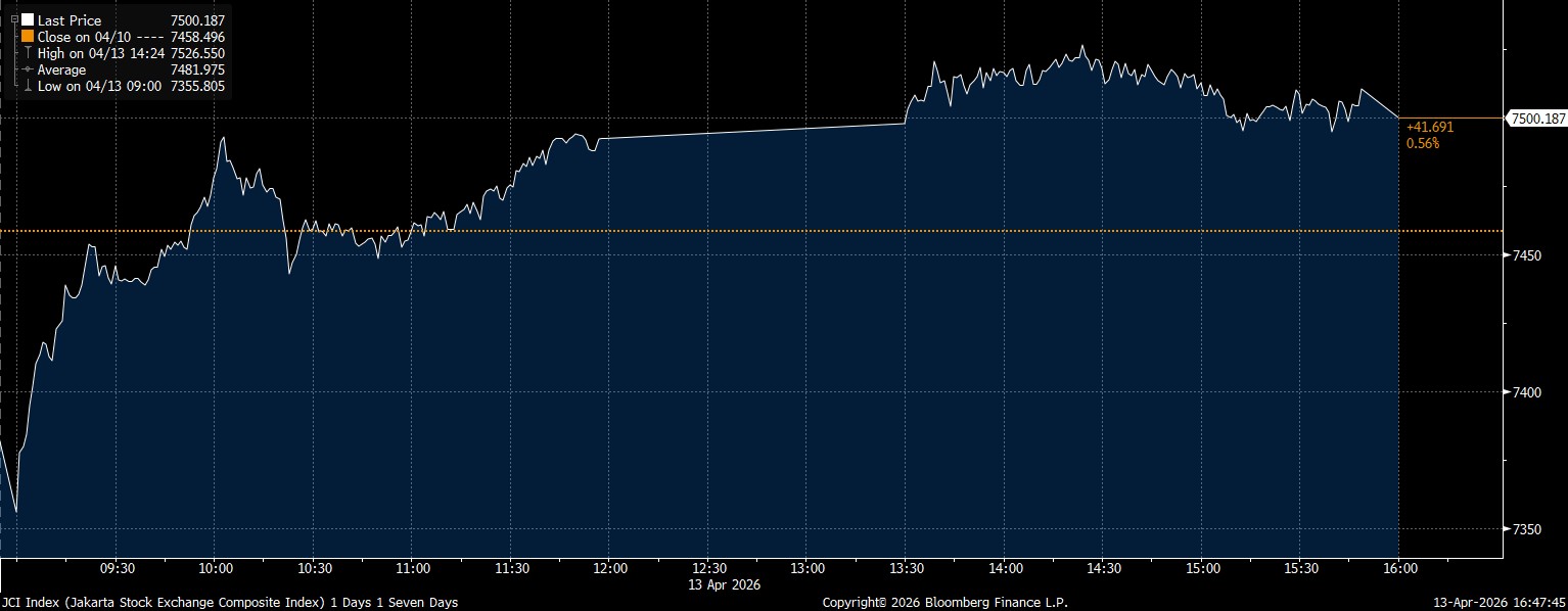 Pada Senin (13/4/2026) tutup perdagangan, IHSG menempati posisi 7.500,18 dengan menguat 0,56% dari posisi penutupan perdagangan hari sebelumnya.