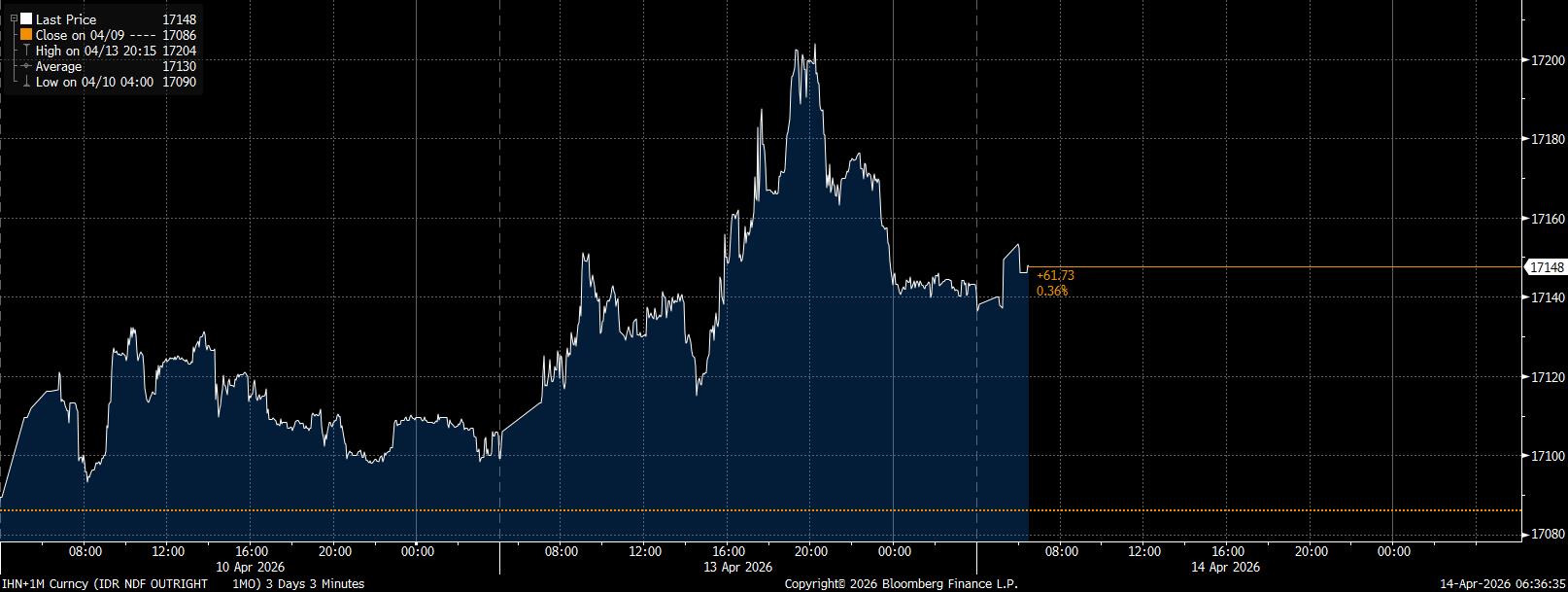 Pada pembukaan perdagangan hari ini, Selasa (14/4/2026), rupiah offshore diperdagangkan di harga Rp17.143/US$, stagnan dari posisi penutupan dini hari tadi. Namun, tadi malam rupiah di pasar luar negeri sempat dibanderol ke level terendah baru Rp17.203/US$ pada pukul 20:15 WIB.