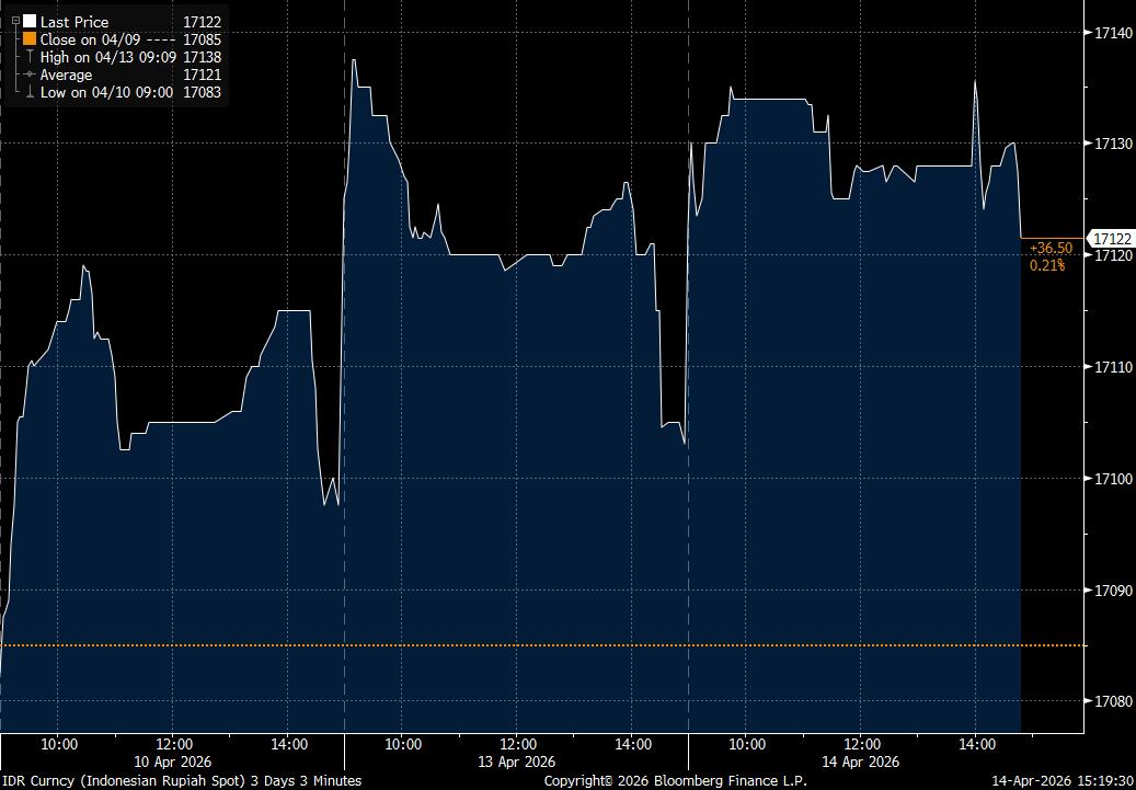 Pada penutupan perdagangan spot sore ini, Selasa (14/4/2026), rupiah diperdagangkan di Rp17.122/US$. Melemah 0,11% dan menjadi mata uang Asia terlemah hari ini.