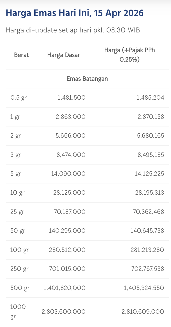 Pada Rabu (15/4/2026), emas Antam dihargai Rp 2.893.000/gram. Menguat Rp 30.000 dibandingkan posisi kemarin.