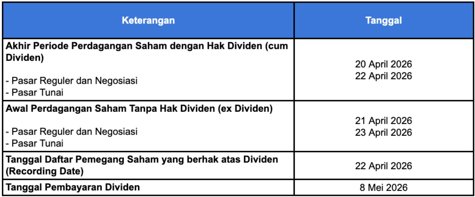 Perseroan menetapkan recording date pada Rabu, 22 April 2026. Tanggal ini menjadi acuan penting bagi investor yang berhak menerima pembagian dividen dari saham BBRI.