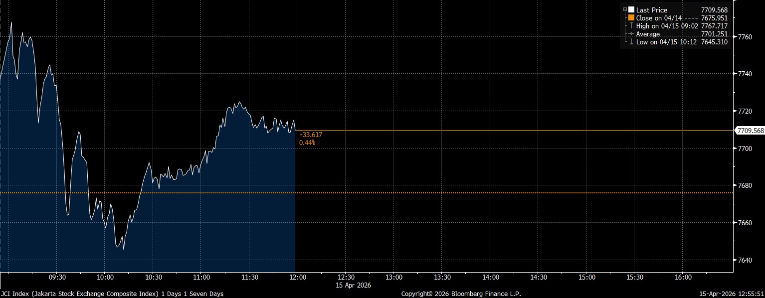 Bloomberg Technoz, Jakarta - Indeks Harga Saham Gabungan (IHSG) ditutup menguat 0,44% di level 7.709,56 pada jeda Sesi I Rabu (15/4/2026) usai bergerak fluktuatif sejak pembukaan pagi hari tadi dengan saham AADI jadi penopang IHSG.