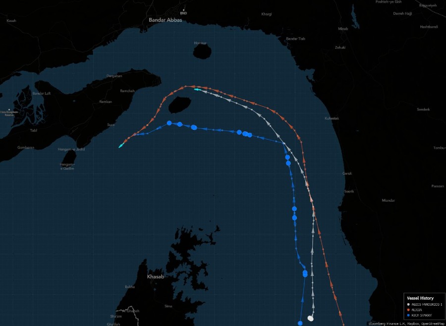 Data pelacakan kapal menunjukkan kapal tersebut masih penuh muatan dengan kargo yang sama saat keluar dari Teluk Persia, meski Bloomberg News belum dapat segera menentukan jenis muatannya.