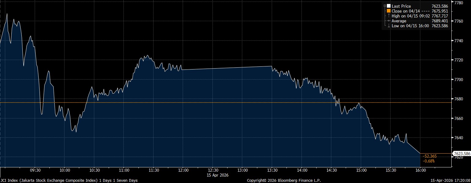 IHSG menutup perdagangan dengan berada di posisi terendahnya sepanjang hari 7.623 intraday. Adapun level tertinggi sempat tersentuh sesaat 7.773 yang terjadi pada perdagangan pagi hari.