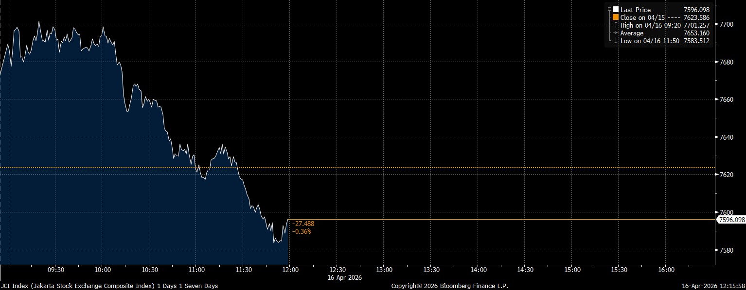 Bloomberg Technoz, Jakarta - Indeks Harga Saham Gabungan (IHSG) ditutup di zona merah dengan pelemahan 0,36% di posisi 7.596 pada perdagangan Sesi I hari ini, Kamis (16/4/2026). Imbas saham–saham big caps bersama saham energi yang turun amat dalam.