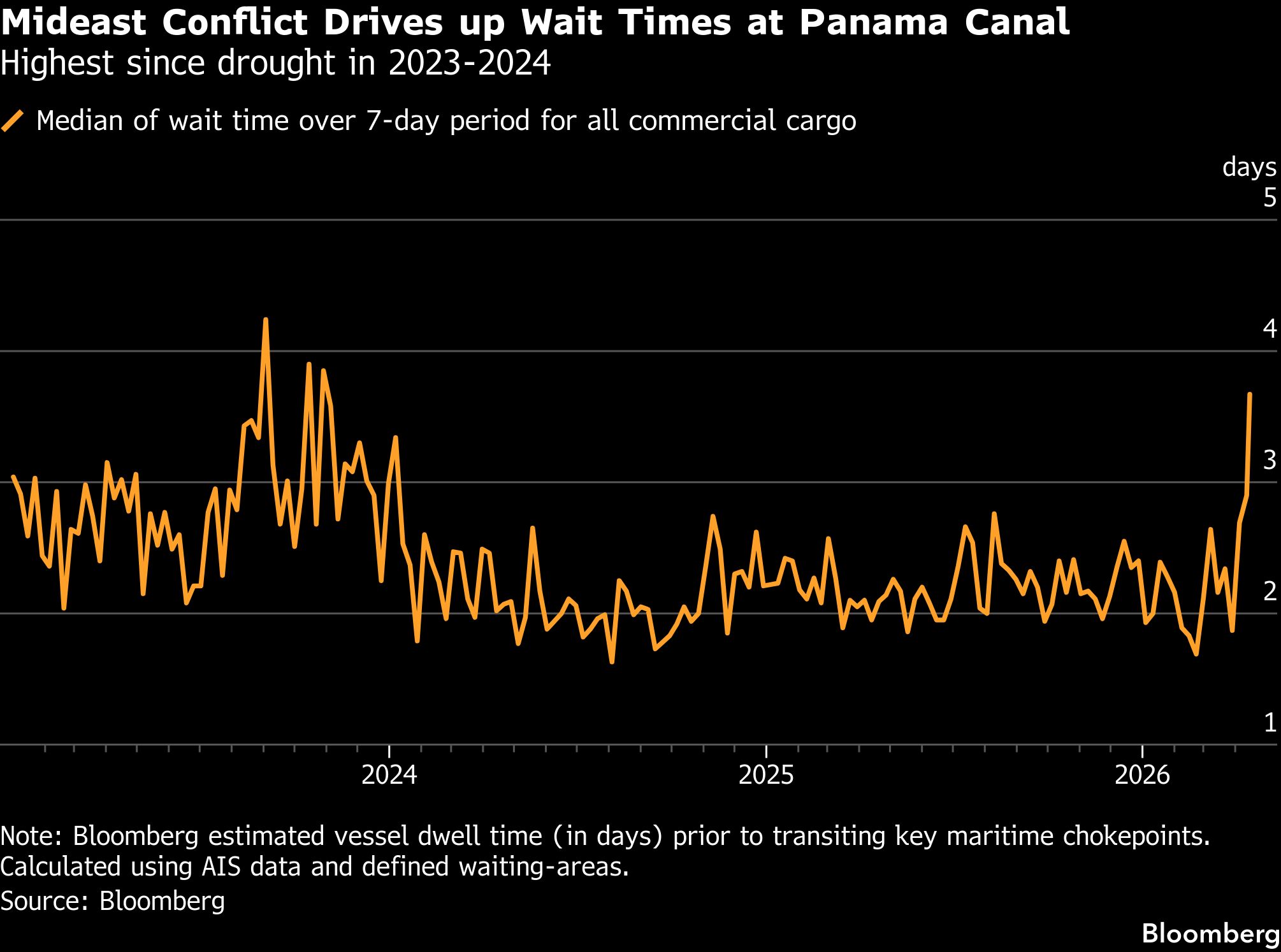 Waktu tunggu adalah median selama periode tujuh hari untuk semua kargo komersial, menurut data yang dikumpulkan oleh Bloomberg, yang mencakup kapal dengan dan tanpa reservasi di kedua arah.