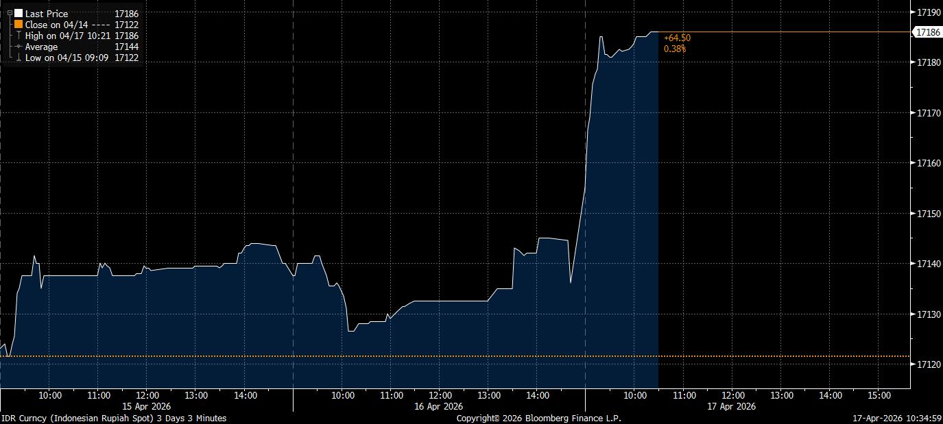 Bloomberg Technoz, Jakarta - Rupiah melanjutkan pelemahannya pada sesi perdagangan Jumat siang (17/4/2026) di tengah ketidakpastian gencatan senjata dan tekanan terhadap fiskal.