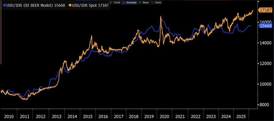 Padahal, berdasarkan model perhitungan Behavioral Equilibrium Exchange Rate (BEER) yang dilakukan tim strategis Bloomberg Intelligence, rupiah undervalued sebesar 8,4%.