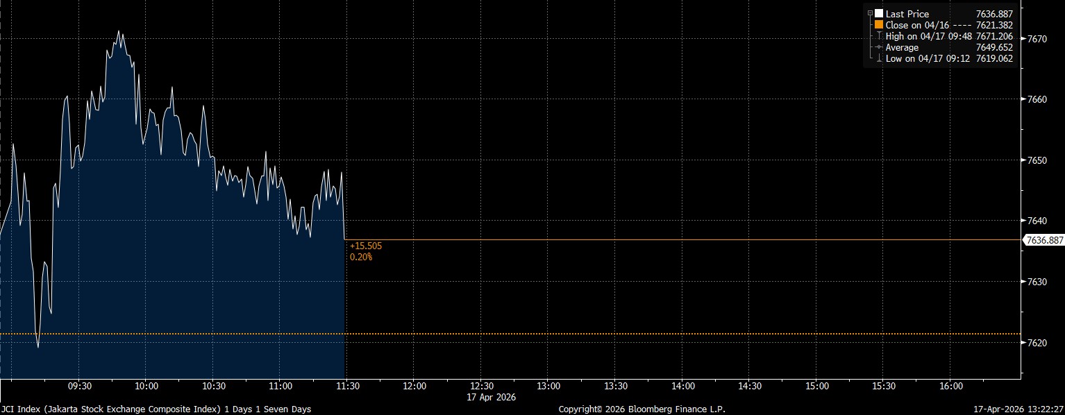 Bloomberg Technoz, Jakarta - Indeks Harga Saham Gabungan (IHSG) menguat 0,2% di posisi 7.636,88 pada perdagangan Sesi I, Jumat (17/4/2026) dengan penguatan saham ASII, saham BREN, hingga saham BRPT jadi penopang.