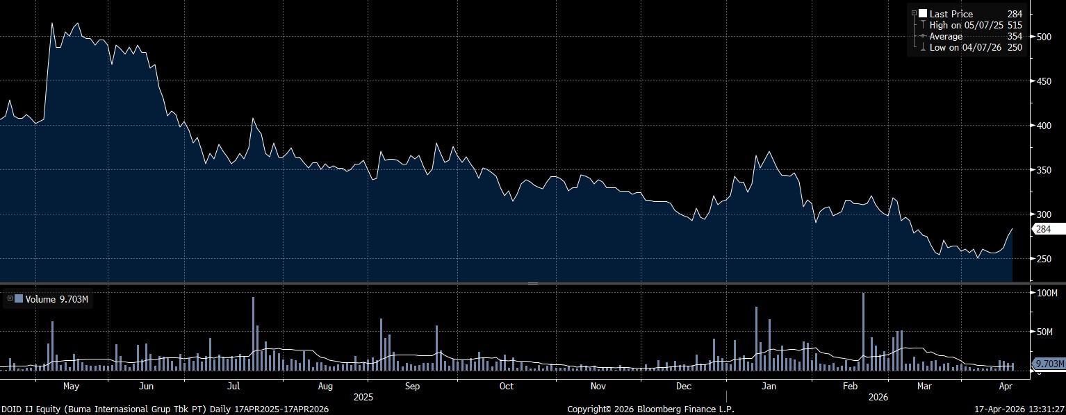 Selepas ditinggal Patrick, harga saham DOID lanjut melemah sampai perdagangan awal tahun ini. Saham DOID susut ke level Rp284 per saham pada perdagangan Jumat (14/4/2026) pukul 13.25 WIB, terkoreksi 30,39% secara tahunan.