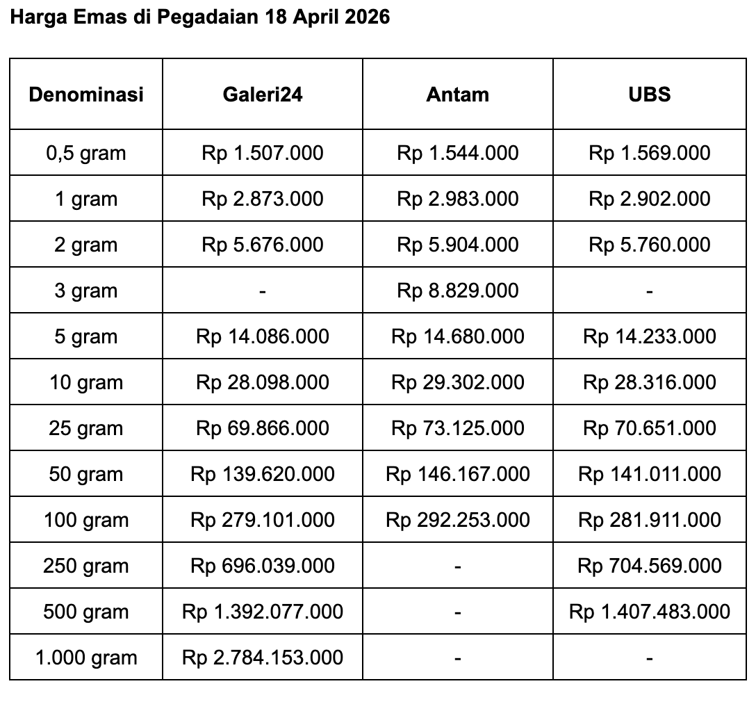 Adapun untuk ukuran 1 gram, harga emas Galeri 24 di Pegadaian adalah Rp 2.873.000. Minus Rp 13.000 dari posisi kemarin.