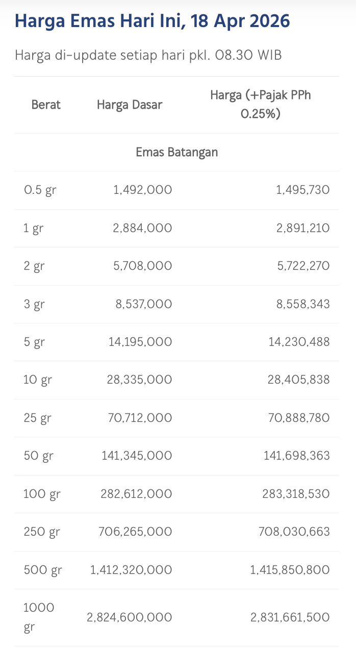 Pada Sabtu (18/4/2026), emas Antam dihargai Rp 2.884.000/gram. Menguat Rp 16.000 dibandingkan posisi kemarin.