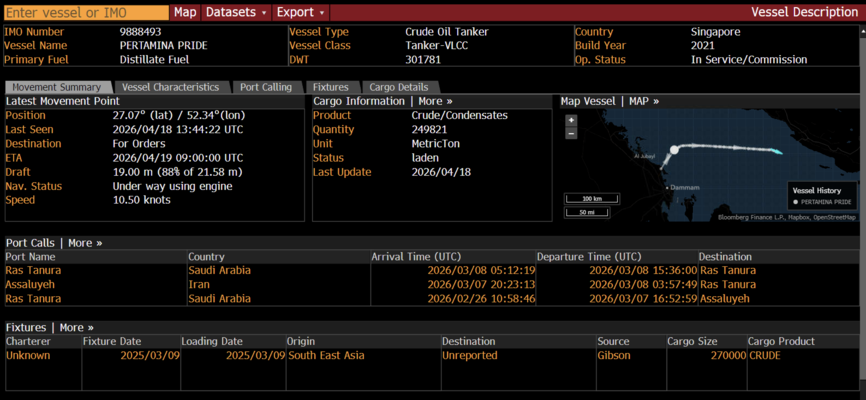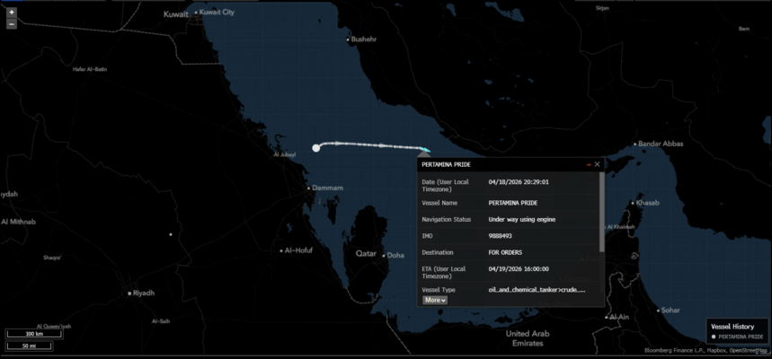 Tanker Pertamina Pride melintas di Selat Hormuz pada Sabtu (18/4/2026). (Data Vessel Bloomberg)