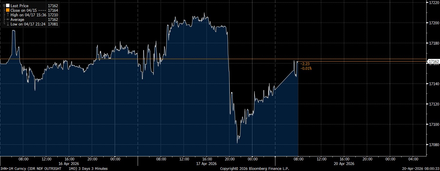 Bloomberg Technoz, Jakarta - Nilai kontrak rupiah terhadap dolar Amerika Serikat (AS) di pasar Non-Deliverable Forward (NDF) dibuka stagnan di level Rp17.170/US$. Rupiah lanjut defensif menuju level Rp17.162/US$. Lantas bagaimana prediksi rupiah di pasar spot hari ini?