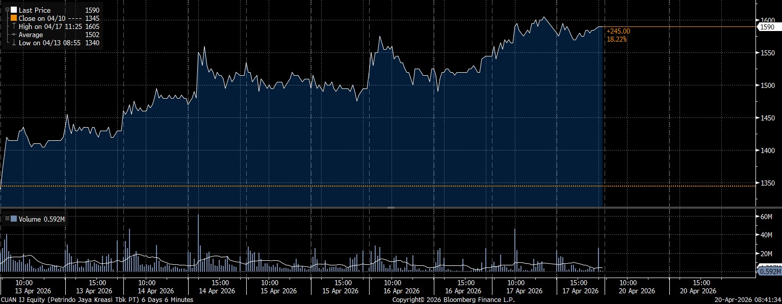 Pada kesempatan yang sama, investor asing net buy saham terbanyak pada emiten PT Petrindo Jaya Kreasi Tbk (CUAN) mencapai Rp440,09 miliar. Didorong tren pembelian, saham CUAN berhasil melesat 18,22% menuju posisi Rp1.590/saham.