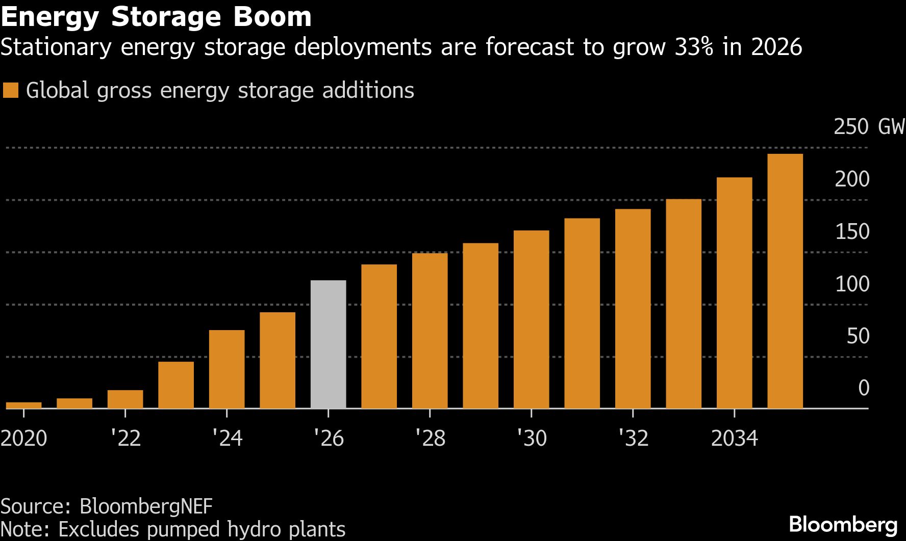 Teknologi ini juga semakin berkembang di tempat lain. India telah meningkatkan lelang proyek penyimpanan energinya karena berupaya menyeimbangkan jaringan listrik yang menerima lebih banyak energi terbarukan yang bervariasi. Brasil sedang mempersiapkan tender pertamanya untuk baterai skala jaringan.