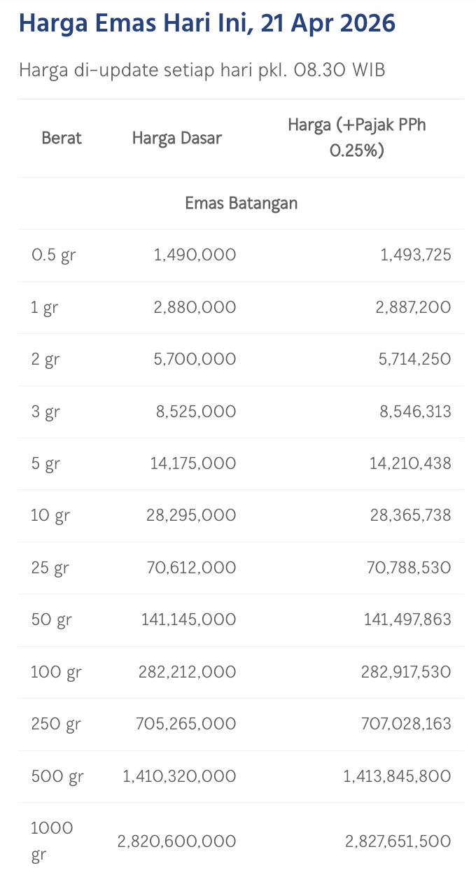 Pada Selasa (21/4/2026), emas Antam dihargai Rp 2.880.000/gram. Menguat Rp 40.000 dibandingkan posisi kemarin.